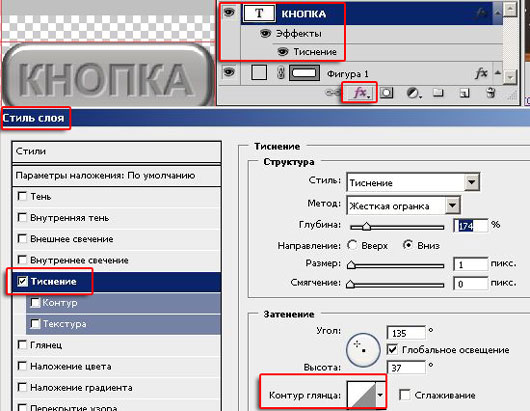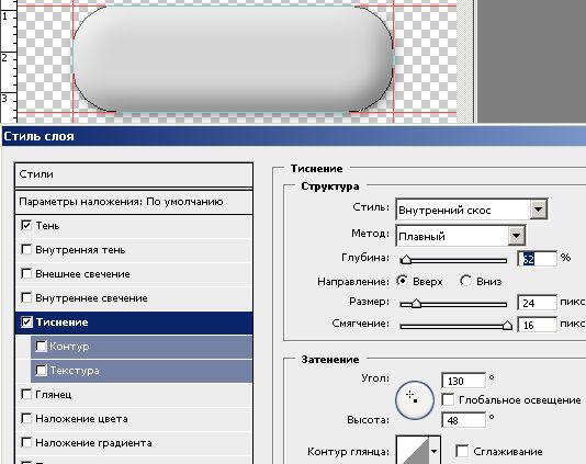 Стиль кнопки можно задать самому, используя инструмент ФУНКЦИЯ на панели СЛОИ. Кликаем дважды на слое кнопки или нажимаем на понели кнопку ƒх. Самый простой вариант - стиль слоя выбираем ТИСНЕНИЕ и выбираем необходимые параметры. Добавляем ТЕНЬ.