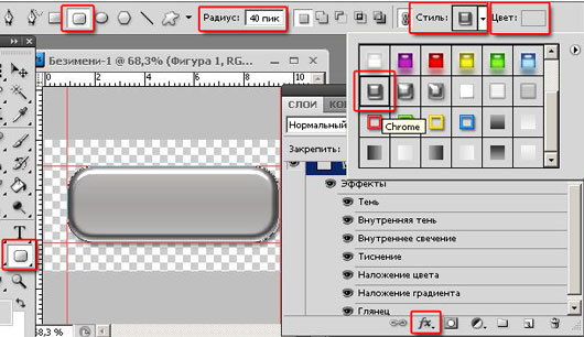Самый простой вариант получить объемную кнопку - выбрать стиль в панели свойств фигуры (или в окне СТИЛИ, которое можно вызвать в основном меню ОКНА-в выпадающем менню выбрать СТИЛИ), которые позволят сделать различные кнопки. В Photoshop уже присутствуют наборы стилей (прозрачные, текстурные). Выбрать из наборов подходящий стиль можно нажав на треугольник справа в наборе. В данном случае набор ВЕБ стили - стиль Хром. После выбора стиля в панели СЛОЙ можно увидеть, из каких элементов функций он состоит. Каждый элемент функции можно корректировать.
