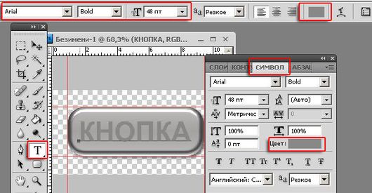 После определения формы, цвета и стиля кнопки переходим к написанию текста кнопки. Рекомендуется создать новый слой для текста, чтоб векторная фигура не прикреплялась к тексту. На панели инструментов нажимаем инструмент текст, и набираем текст на изображении кнопки. Кликаем на инструмент перемещение. Открываем окно СИМВОЛ и выбираем шрифт, цвет и размер.