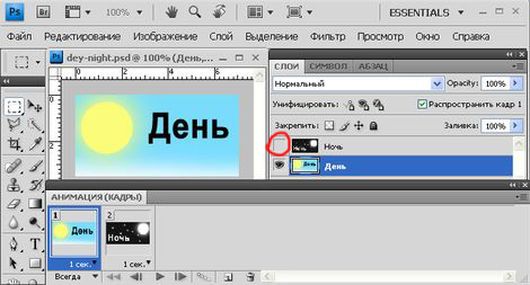 Слой 1 и слой 2. Создаем в окне анимации 2 кадра. Задаем время показов. В первом кадре оставляем включенный слой 1, слой 2 выключаем. Просматриваем анимацию и сохраняем для веб устройств в формате GIF. Для более точной передачи цветовой гаммы выставляем количество цветов 256.