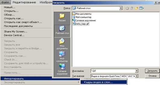 Что делать, если необходимо уменьшить размер анимированного баннера (изображения), а нет PSD исходника? Напряпрямую готовый гиф со слоями в фотшоп не откроешь. Это можно сделать в Corel Photo paint. Как уменьшить размер анимированного gif баннера в фотошоп? Тут надо знать маленькую хитрость. В Фотошоп gif анимацию загружаем через меню ФАЙЛ - импортировать - кадры видео в слои. На данном этапе и начинается фокус. Во первых, на компьютере должен быть установлен Quick Time Player. Во вторых, в открывшемся окне загрузки сразу наш gif не найти (по умолчанию-видео форматы). Чтобы найти наш баннер, необходимо в строку ИМЯ ФАЙЛА в окне поиска Фотошоп при импорте написать расширение гиф следующим образом - "*.GIF" без кавычек.