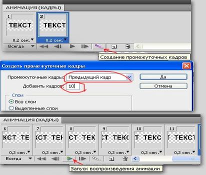 В окне АНИМАЦИЯ внизу слева от кнопки создание нового кадра нажимаем на Добавление промежуточных кадров, в открывшемся окне задаем количество промежуточных кадров, допустим 10 с параметром «предыдущий кадр» (чем больше кадров зададим, тем плавне будет движение анимации, но, соответственно, увеличится вес изображения баннера) жмем ДА. По идее анимация готова. Теперь надо проверить анимацию. В окне АНИМАЦИЯ жмем на кнопку воспроизведение анимации и просматриваем в основном окне программы на баннере движение текста.