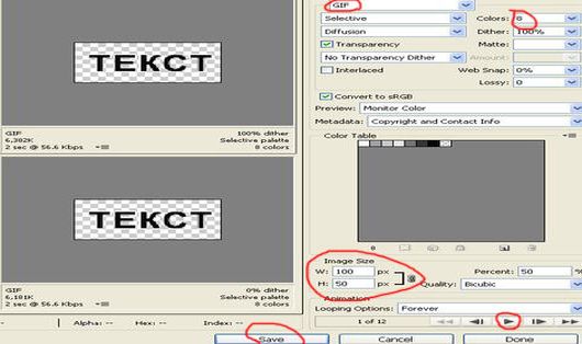 Если все устраивает – сохраняем – жмем ФАЙЛ - сохранить для web устройств. Перед сохранением нужно чтоб активный кадр был первым на готовом баннере (с него начнется анимация) или задать кадр для начала анимации. При сохранении для веб устройств открывается окно, в котором задаем формат GIF (только формат GIF для анимации!) если надо выбираем количество цветов colors (чем меньше оттенков, тем легче баннер), для данного черного текста хватит 8 цветов. Цикличность (looping option) оставляем forewer (без остановки). В этом окне сохранения для веб устройств можно поменять размер баннера – уменьшим – 100 на 50. Здесь же можно просмотреть результат анимации. Если все устраивает – жмем Save и указываем место сохранения баннера, допустим на рабочий стол. Назвать для последующей загрузки на сайт необходимо латинскими буквами, например banner_text. Просматриваем готовый баннер и если устраивает – можно загружать на сайт. Такой же эффект движения можно сделать не только с текстом, но и с частью изображения (объектом).