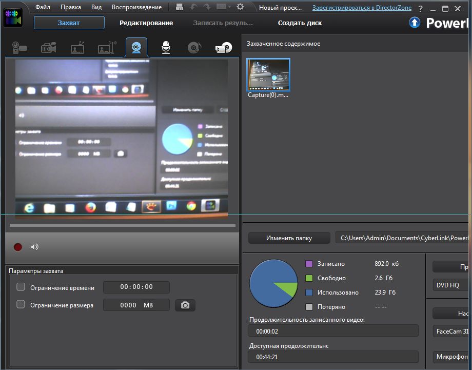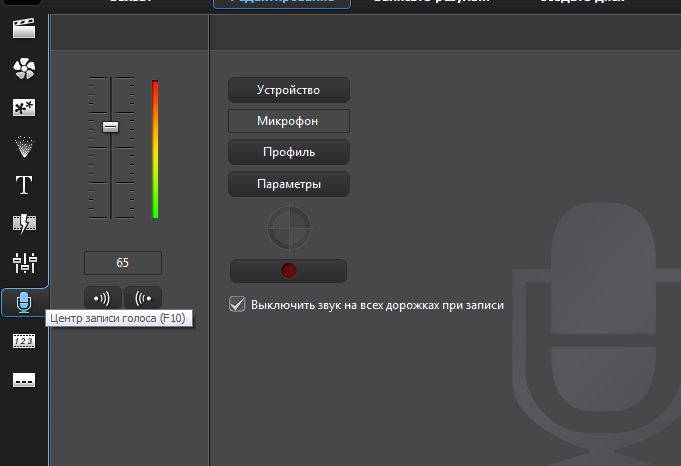 Главное меню программы содержит разделы (выпадающие меню) со стандартными для программ функциями. Необходимо отметить кнопки пропорции и ПАРАМЕТРЫ, открывающее панель настроек программы. Основные кнопки ЗАХВАТ позволяют получить видео из разных источников (видеокамера, веб камера, телевизор и др.). РЕДАКТИРОВАНИЕ (основная функция), ЗАПИСАТЬ РЕЗУЛЬТАТ (создает фильм в выбранном формате), ЗАПИСАТЬ НА ДИСК - запись фильма сразу на DVD диск.