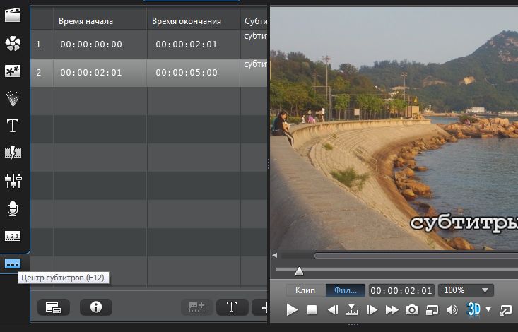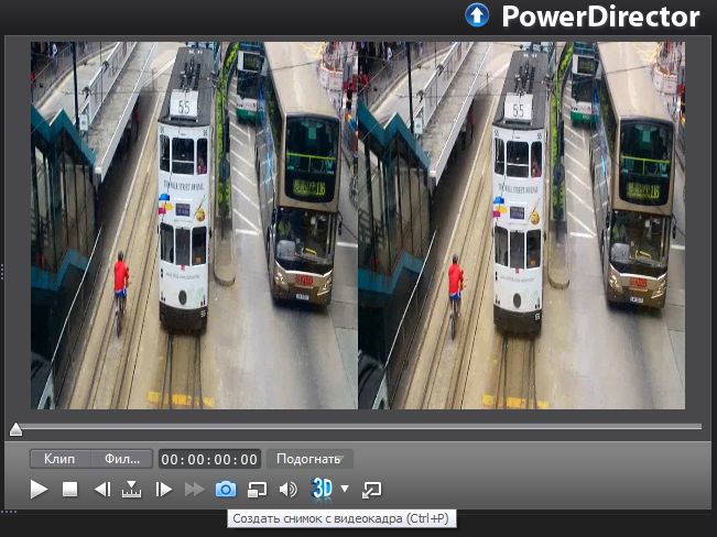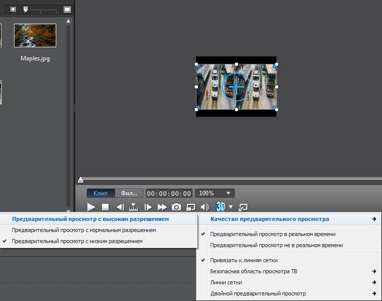 В окне предварительного просмотра происходит просмотр медиа файлов библеотеки и визуализация результатов редактирования видео. В нижней панели окна с помощью элементов можно задать место воспроизведения, перемещая ползунок, перемещать видео покадрово вперед и назад, сделать снимок с экрана предварительного просмотра, режим 3 d просмотра, задать масштаб экрана и качество воспроизведения в окне.