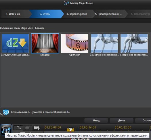 Интерфейс программы cyberlink power director состоит: панель настроек с разделами главного меню, панель инструментов инстркментария с окном библиотеки мультимедиа, окно предварительного просмотра, панель рабочего пространства редактирования.